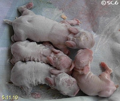 Nyx x Sugardaddy - 1 nicely broken black fostered to Anaba, and a black. I don't trust Nyx. So far, she hasn't built a good nest and if she has live kits, they die if left with her. She did pull plenty of fur this time, but most of the other nest material had been kicked out. Good thing it was warm enough. I left her the black to see if she raises it.